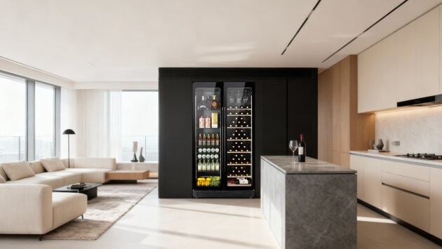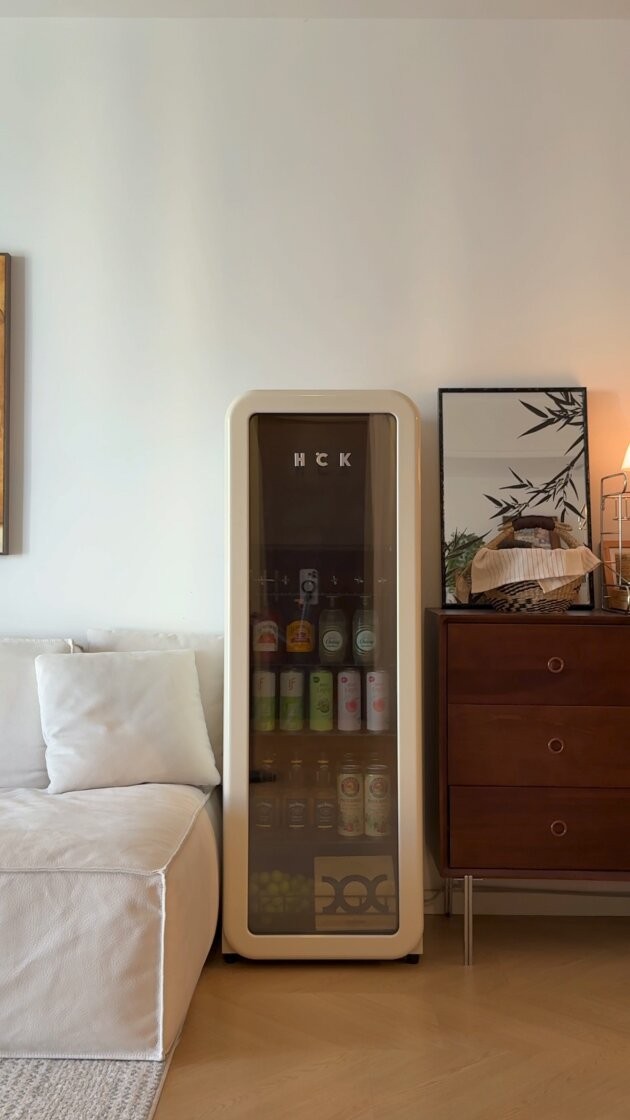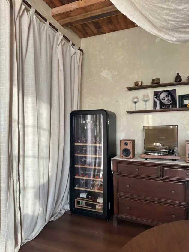 圆弧冰吧通透玻璃门搭配复古外观,双温区精准控温,既能冷藏饮品、食材,又能收纳美妆、零食,完美适配客厅餐边柜、开放式厨房、休闲娱乐区,成为空间视觉焦点。