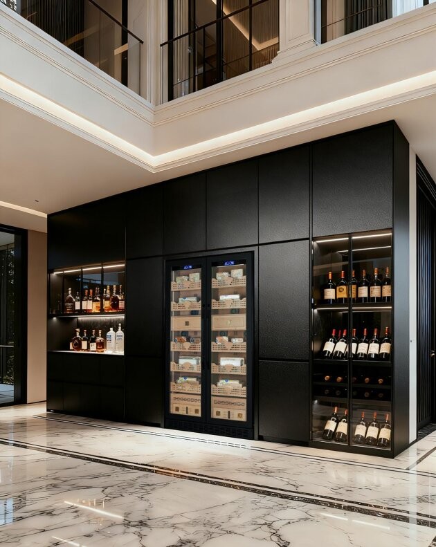 专业雪茄柜采用西班牙原生雪松木内饰,分区独立控温控湿,搭配智能监控系统,为高净值人群打造专属养茄空间,适配书房、休闲室定制。